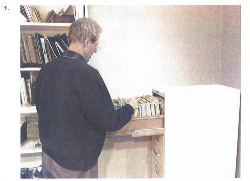 (A) Anh ấy đang nhìn vào trong một ngăn kéo.