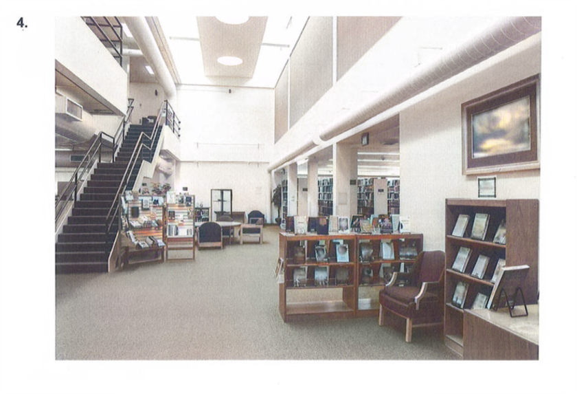 4. (A) Some armchairs are occupied.(B) Books and magazines have been arranged on shelves.(C) A gate has been placed at the bottom of a stairway.(D) A painting has been left on the floor