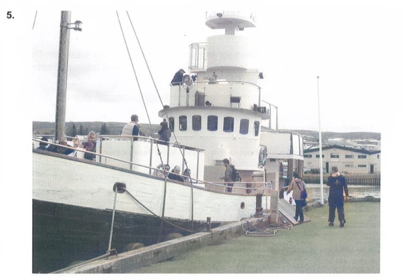 5 (A) A flag is being raised on a pole.(B) A ship is approaching a pier.(C) Some people are walking toward a boat.(D) Some workers are sweeping a dock.