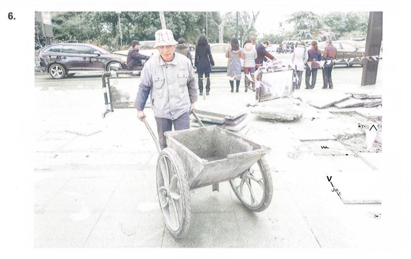 6.(A) A man is putting up a metal barrier.(B) Some people are boarding a bus.(C) A cart is being loaded with bricks.(D) A wheelbarrow is being pushed at a work site.(A) Người đàn ông đang dựng hàng rào kim loại.(B) Một số người đang lên xe buýt.(C) Một xe hàng đang được đẩy vào công trường(D) Xe cút kít đang được đẩy tại nơi làm việc. |